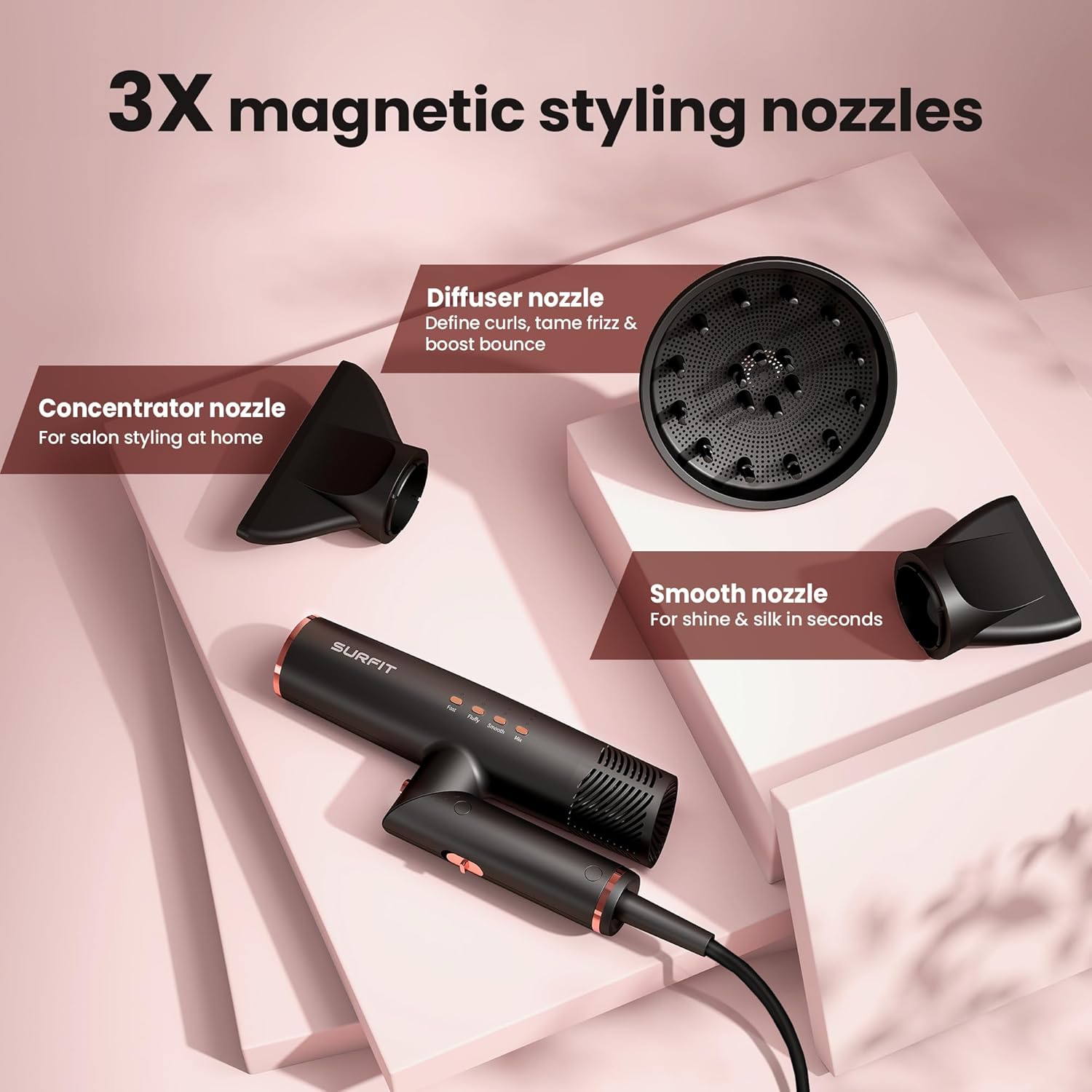 The Surfit Ionic Hair Dryer delivers powerful performance with a 110,000 RPM high-speed motor for ultra-fast drying in just one minute. Designed to prevent heat damage, its advanced ionic technology reduces frizz, boosts shine, and keeps hair smooth and healthy.